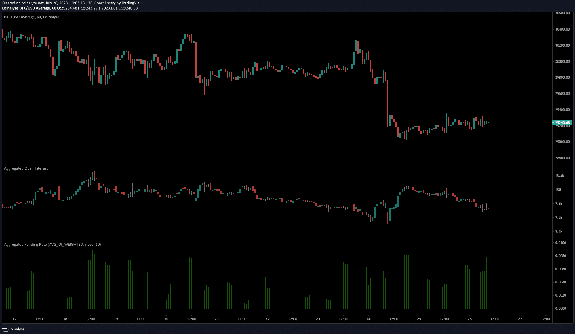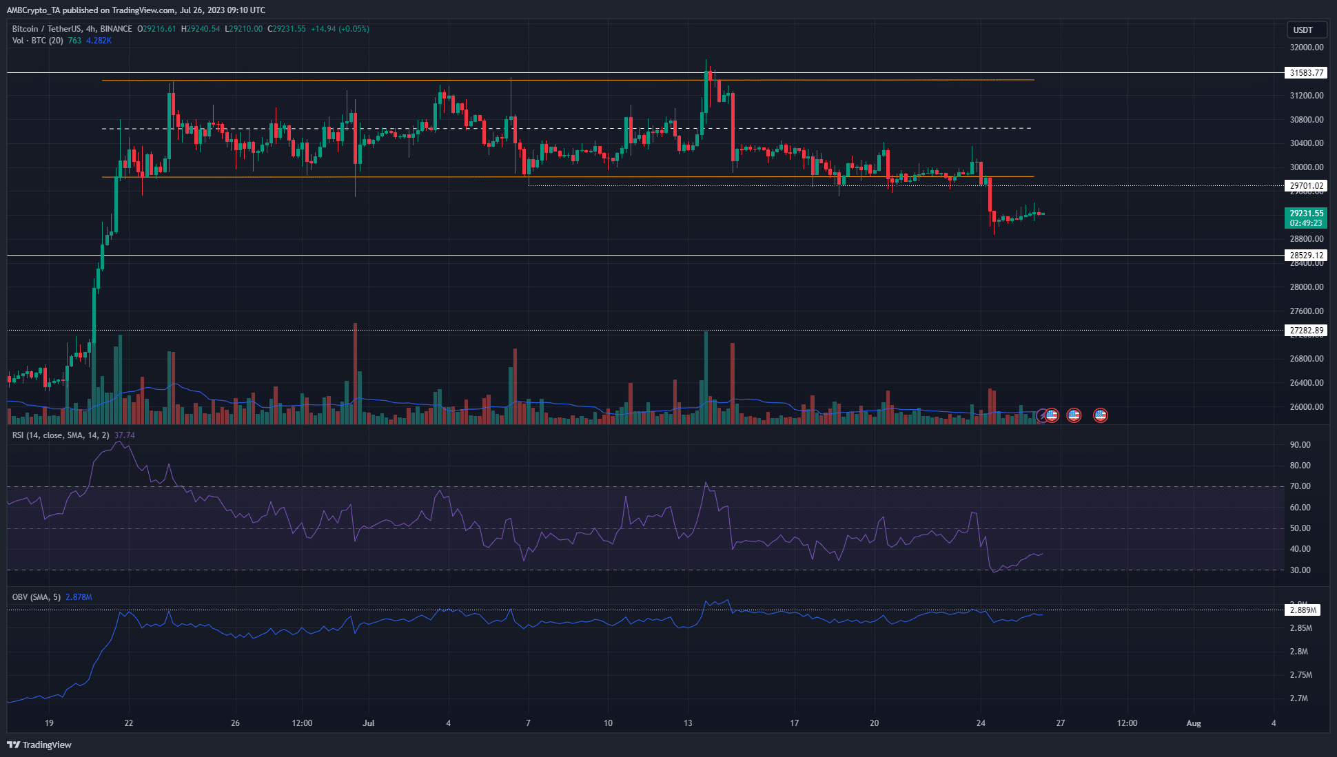 7 月 24 日,比特币 [BTC]跌破 29800 美元的区间低点。这是看跌意图的强烈信号,但在过去 48 小时内,空头无法进一步向南推进。从长期来看,比特币的价格走势看涨。