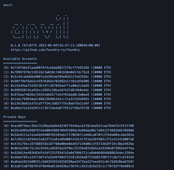 Anvil是一个用于开发目的的本地测试网节点,可以用来分叉预先存在的网络。关于Anvil的详细内容,请查看:https://book.getfoundry.sh/anvil/