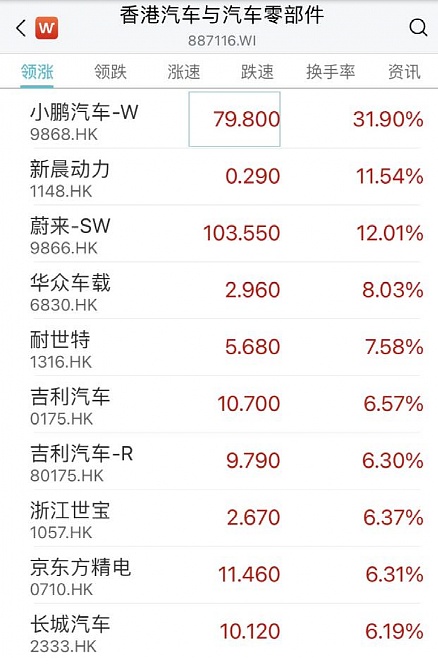 小鹏汽车带动港股造车新势力走强,蔚来涨超12%,理想汽车、零跑汽车等跟涨。