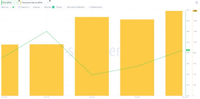 截至 7 月 22 日这一周初,以太坊网络上的交易量为 114 万 ETH。然而,到7月27日,日交易量已逐渐攀升至188万ETH。这意味着仅本周交易活动就激增了 65%。