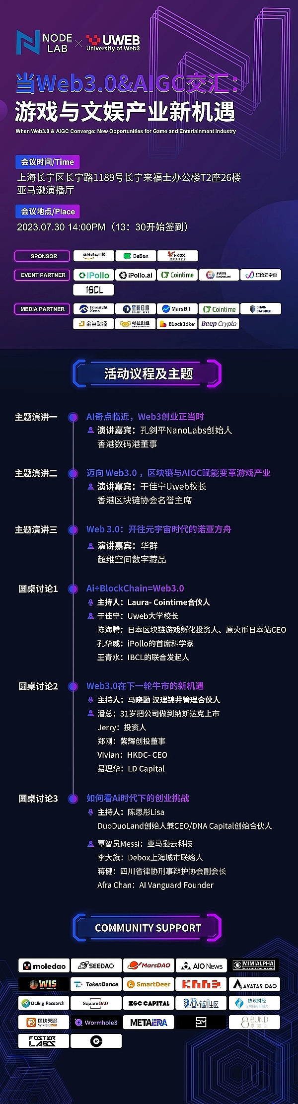 7月30日,由Node Lab、Uweb主办的线下峰会「当Web 3.0&AIGC交汇:游戏与文娱产业新机遇」将在上海举办,杭州伦萨科技有限公司(超维空间、超维元宇宙)受邀参会,CEO华群将发表演讲。