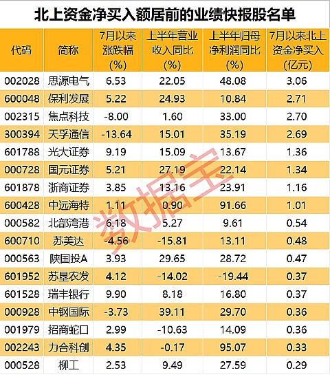 资金面来看,7月以来,思源电气、保利发展、焦点科技等8股获得北上资金超亿元加仓。值得关注的是,中国中免7月以来北上资金累计净买入额为净流出8.19亿元,但本周北上资金已净买入3.55亿元,外资呈现回流迹象。