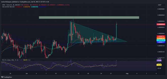 在过去的几个小时里,SHIB 的价格见证了交易量和购买压力的大幅飙升。结果,价格突破了 0.000008 美元的关键阻力线。Shiba Inu 触及 0.00000839 美元附近的高点,但由于购买活动较低而未能进一步延续。截至撰写本文时,SHIB 的交易价格为 0.00000823 美元,在过去 24 小时内飙升超过 5.7%。