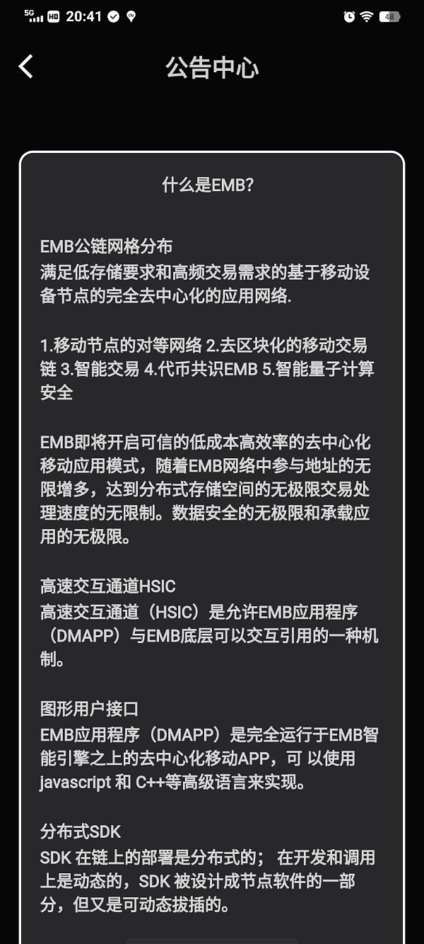 特征独立公链EMB独立公链的特征意味着这是属于EMBToken持有人独有的交易领域。EMB公链具有可验证的区块代码-区块浏览器-公链公开代码特征未来价值EMB公链具有与主流货币一致的公链高度标准。兼容全面互联、客体应用生态的测试环境与非功能性测试非同质交易属性使得EMB令牌的价值不断上涨。