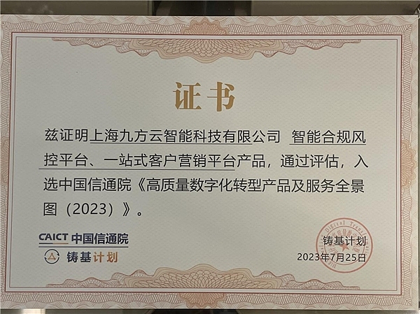 九方智投受邀参与数字化产品及服务能力规范(DSSC)标准的编写,并入选信通院DSSC首批认证企业,同时九方智能合规风控平台和一站式客户营销平台(Finder)两项核心产品入选信通院《2023高质量数字化转型产品及服务全景图(2023上半年)》。