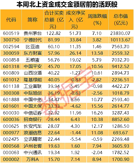 数据宝统计,本周共有36股登上北上资金成交活跃榜,所属行业来看,食品饮料、非银金融、电气设备股本周成交活跃,合计买卖总额在100亿元以上。食品饮料、非银金融、电气设备行业净流入超30亿元,仅电子行业少量减持。