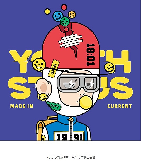 当代青年是将现代社会年轻人生活状态可视化,作为每个人的大脑,是所有拥有相同状态的人;嘴巴被封上了创可贴,是人与人之间的沟通有时往往不尽人意,不如关上嘴巴停止表达。但不管社会的压力有多大,开心最重要呀!