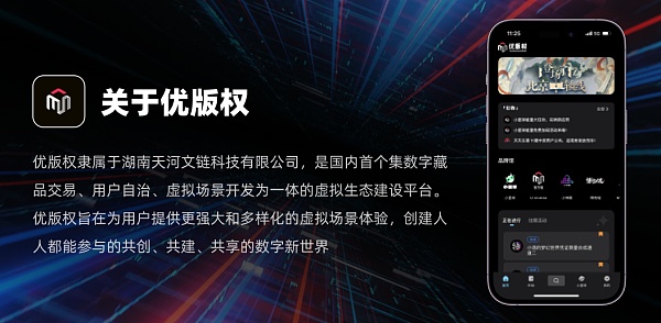 优版权隶属于湖南天河文链科技有限公司,是国内首个集数字藏品交易、用户自治、虚拟场景开发为一体的虚拟生态建设平台。