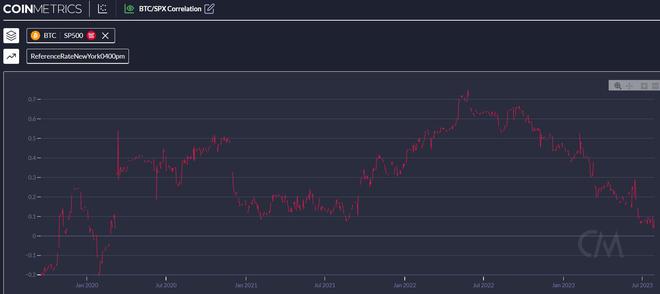 根据CoinMetrics 的数据,比特币与(诚然科技主导程度较低的)标准普尔 500 指数的 60 天皮尔逊相关性最后约为 0.1(非常弱,但仍然为正),低于 2022 年上半年高于 0.70 的高点。