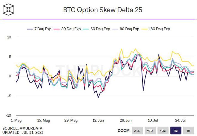 根据The Block提供的数据,7、30、60、90 和 180 天到期的比特币期权的 25% Delta 偏差均保持在零以上。