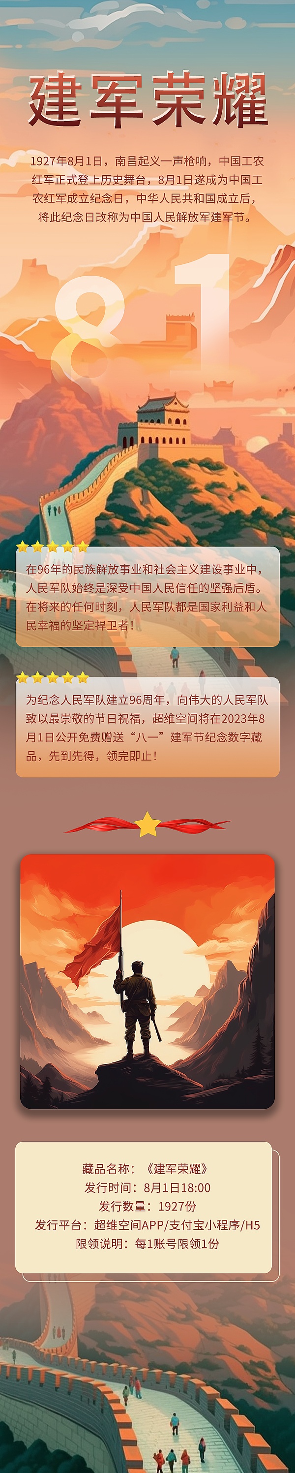 为纪念人民军队建立96周年,向伟大的人民军队致以最崇敬的节日祝福,超维空间将在2023年8月1日公开免费赠送“八一”建军节纪念数字藏品,先到先得,领完即止!