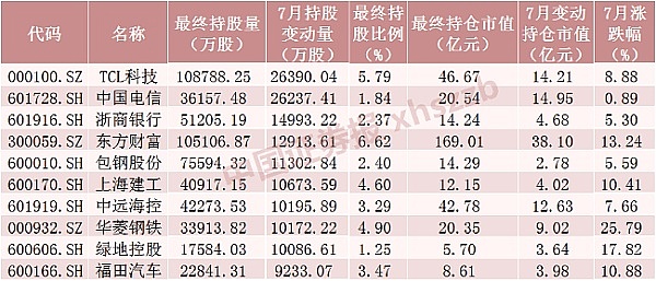 7月北向资金持股增加数前十的股票均上涨,华菱钢铁涨幅最大,上涨25.79%。