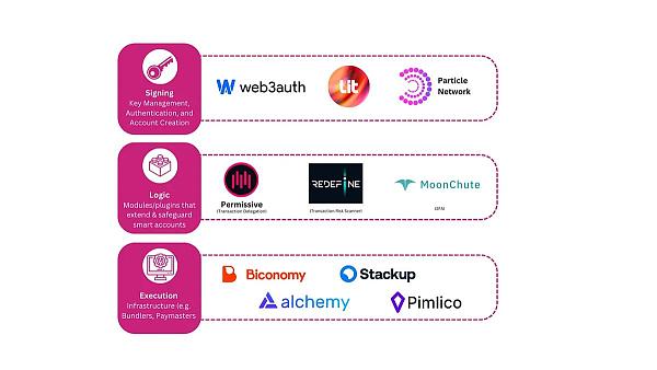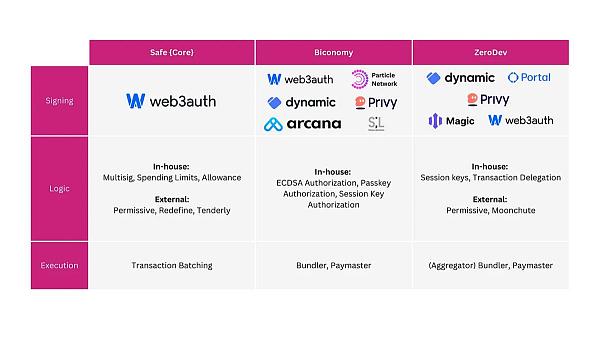 在这些独立组件的基础上,出现了三个聚合器,它们汇集了签名方法、逻辑模块和执行基础设施,类似于「模块应用商店」:Safe {Core}、Biconomy 和 ZeroDev。