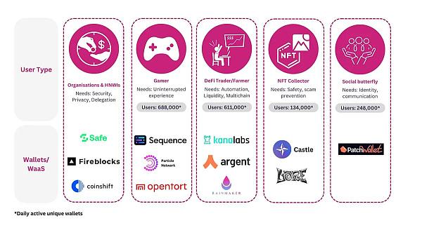 随着 Web3 的新领域找到产品市场适配度,我们预计专业钱包将捕获市场份额,因为它们更贴近特定用户需求。游戏玩家、DeFi 用户和 NFT 收藏家已经有现有的智能钱包可供使用,但这些领域仍然相对竞争激烈(没有明显的主导者)。