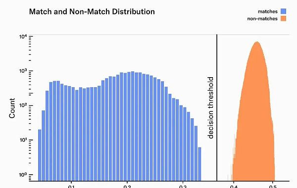 这些虹膜哈希值只会泄露少量数据。如果对手可以强行(或秘密)扫描你的虹膜,那么他们就可以自己计算出你的虹膜哈希值,并将其与虹膜哈希值数据库进行核对,以确定你是否参与了该系统。这种检查某人是否注册的功能对于系统本身来说是必要的,可以防止人们多次注册,但这种功能总是有可能被滥用。
