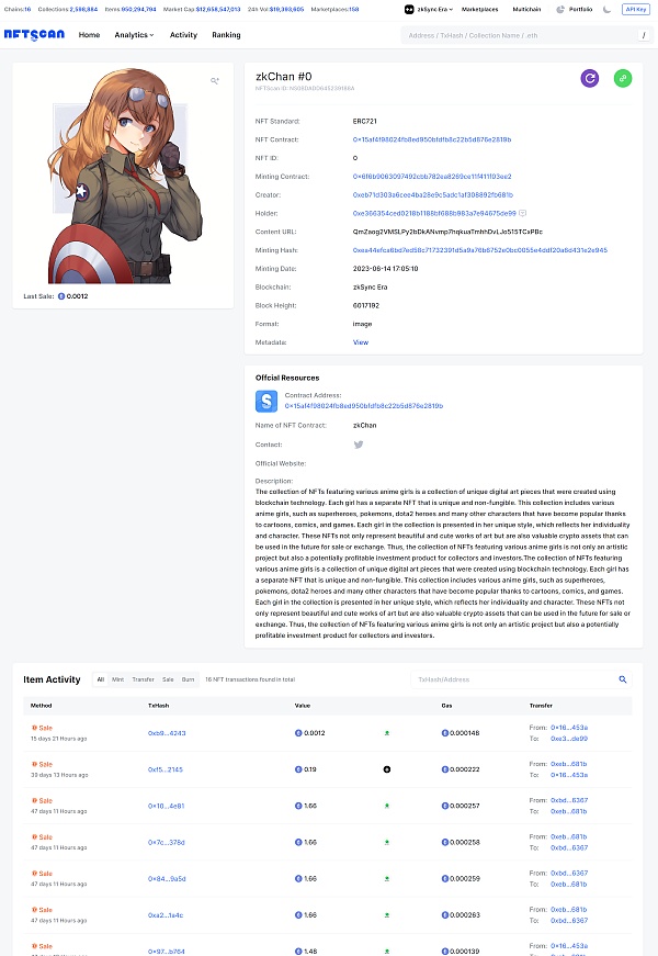 2023 年 8 月 2 号,NFTScan 团队正式对外发布了 zkSync NFTScan 浏览器,将为 zkSync 生态的 NFT 开发者和用户提供简洁高效的 NFT 数据搜索查询服务。NFTScan 作为全球领先的 NFT 数据基础设施服务商,zkSync 是继 Bitcoin、Ethereum、BNBChain、Polygon、Solana、Arbitrum、Optimism、Aptos 等区块链之后,NFTScan 浏览器支持的第 16 条区块链网络。