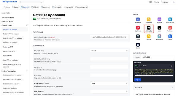 目前,NFTScan 开发者平台也已经同步上线了 zkSync 网络的 NFT API 数据服务,目前对外开放了多个 API 查询接口,满足各种业务场景下对 zkSync NFT 数据的索引需求。如果你是 NFT 和 Web3 领域的开发者,欢迎使用 NFTScan 开发者平台提供的 zkSync 网络的 NFT API 数据服务,低门槛的快速在 zkSync 网络上构建产品和协议。
