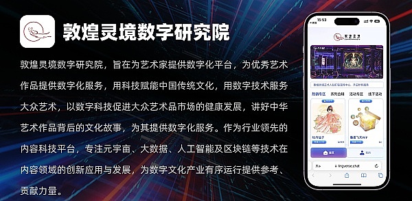 敦煌灵境数字研究院,旨在为艺术家提供数字化平台,为优秀艺术作品提供数字化服务,用科技赋能中国传统文化,用数字技术服务大众艺术,以数字科技促进大众艺术品市场的健康发展,讲好中华艺术作品背后的文化故事,为其提供数字化服务。作为行业领先的内容科技平台,专注元宇亩、大数据、人工智能及区块链等技术在内容领域的创新应用与发展,为数字文化产业有序运行提供参考、贡献力量。