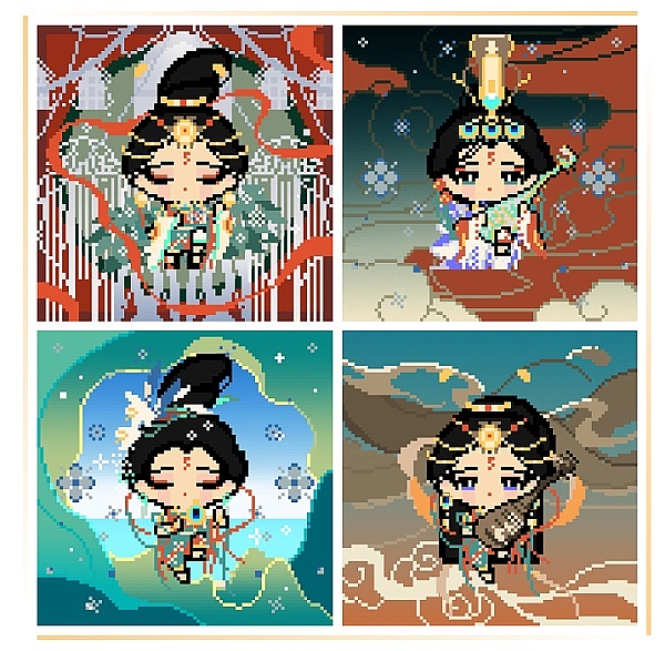 诗仙李白曾描绘敦煌飞天之美:“霓裳曳广带,飘拂升天行。”飞天脚踏祥云,舞带舒展,呈现出自由逍遥、热情奔放、气势宏大、场景华丽的特征,正是盛世大唐的传神写照。此刻,敦煌灵境将敦煌飞天之美,融古今于一体,汇万象于一端,倾心设计全新系列 —— 敦煌像素飞天PFP。