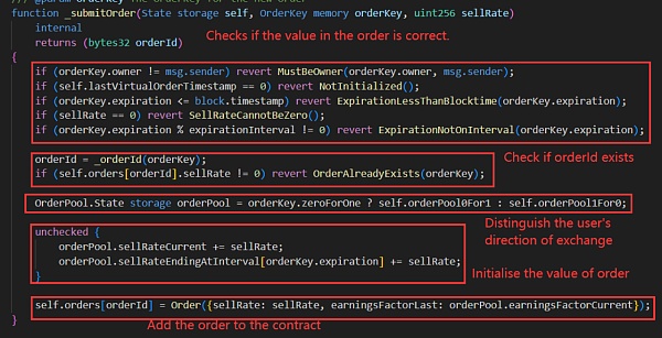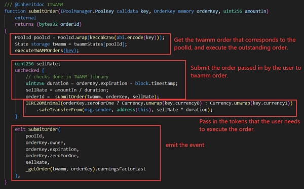 用户可手动调用TWAMM中的submitOrder函数来提交自己需要执行的order到合约中。