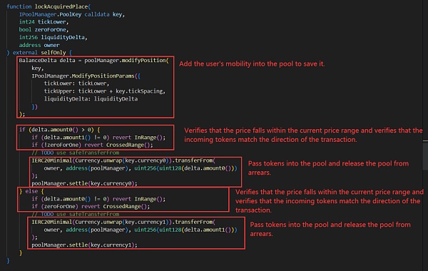 用户调用place函数传入想要添加流动性的数量,价格以及交易方向,hook会先将用户想要添加的流动性加入pool中保存,随后为用户创建对应的限价单。