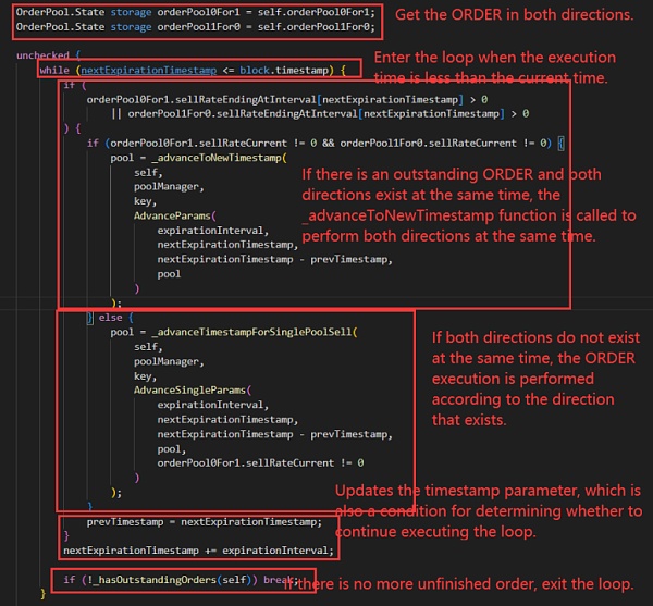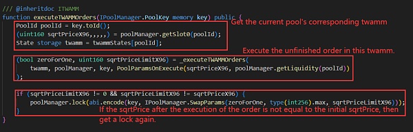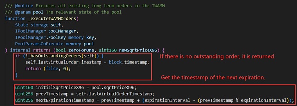 每有用户调用v4的swap函数进行交易或modifyPosition函数更改仓位,都会触发TWAMM中的执行函数,函数中会调用内部函数_executeTWAMMOrders继续进行此前未完成order的执行。