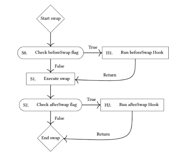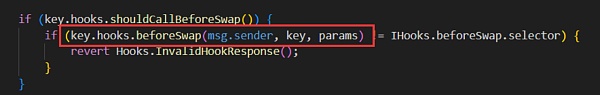 可以看到在执行 swap 的前后,pool 会先检查 pool 对应的 Hook 是否开启了相应的 flag,如果开启了,就会自动调用 Hook 合约的相应函数。