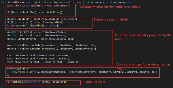 用户可在想要移除流动性时调用withdraw函数,即可提取想要的流动性。