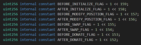Hook 合约需要显式指定在上述的哪些阶段进行执行,而 pool 则需要知道对应的 Hook 在某个阶段是否需要执行,为了节省 gas,这些 flag 都没有在合约中进行存储,而是需要 Hook 使用特定的地址来标明。具体判断的代码如下: