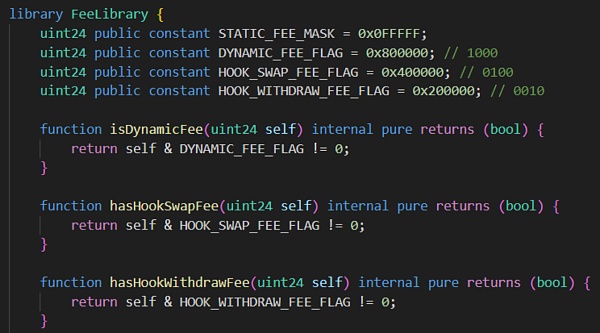 在创建 pool 时,需要使用 fee 参数(uint24)前 4个 bit 来标记此 pool 是否使用动态 fee,以及是否启动 hook swap fee 和 withdraw fee: