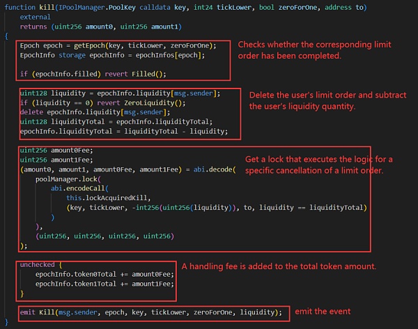 用户可在限价单完成之前调用kill函数取消限价单并获得此次添加流动性获得的收益。