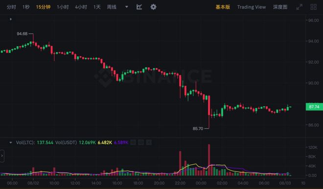 据币安交易所数据图表,莱特币在24 小时内一路阴跌,并在减半来临之后,先短暂往上拉升后发生较大幅度的插针,最低下探至$85.7。