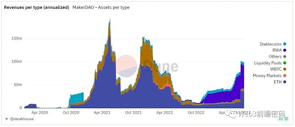 而Maker协议收入主要来源包括:1)铸Dai的稳定费收入,即借Dai利息;2)清算抵押不足资产所获的清算罚金收入;3)RWA资产收益。自2022年11月之后,RWA成为Maker最大收益来源。
