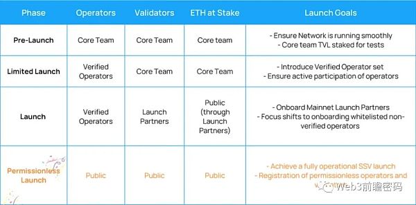 上周,SSV发布了主网上线规划,明确了各阶段协议参与方、工作目标和上线时间。SSV主网上线分为四个阶段:目前处于第一阶段Pre-Launch,运营商、节点以及质押的ETH全部来自于团队;第二阶段Limited Launch预计8月上线,引入合作方运营商、节点以及质押的ETH来自团队;第三阶段Launch预计9月份上线,保持合作方运营商,引入合作方节点与ETH质押,该阶段将协议TVL纳入团队工作目标;第四阶段Permissionless Launch,全面放开运营商、节点与ETH质押的范围,预计11月份上线。
