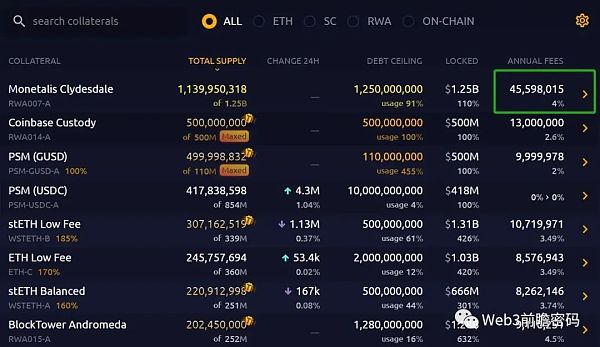 在RWA资产中,由Monetalis Clydesdale管理的美债年化收益最高,是Maker最大CDP债仓stETH收益的4.5倍左右,对改善Maker协议收支发挥重要作用。