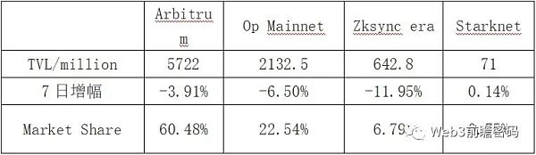 TVL方面,Balancer V2在Arbitrum上的TVL超过Curve,1m TVL增长35%,在Polygon上的RWA ve(3,3)概念的PearlFi连续两周增长显著,目前在Polygon上TVL排名第五;WooFi在几条L2上的TVL增长明显,Starknet上Myswap TVL增长显著。