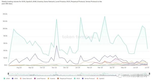 上周(7月3日至7月9日)衍生品DEX的整体交易量较此前一周出现明显下跌。9个主要衍生品DEX协议的周交易量约为8.6亿美元,而此前一周的周交易量约为15.2亿美元,跌幅高达43%。整体来看,本周交易量位于本年较低水平,5月底、6月初的周交易量为2023年度内最低水平,大约为6.6亿美元左右。