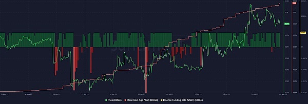 根据Santiment 的数据,DOGE 的资金利率保持正值。尽管有所回落,但该资产的需求仍保持稳定。此外,DOGE 的 90 天平均币龄呈上升趋势,表明投资者对狗狗币的持续积累充满信心。