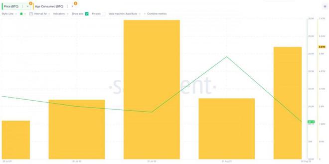 目前, BTC消耗年龄为 597 万,比 7 月 29 日记录的 206 万增长了 190%。