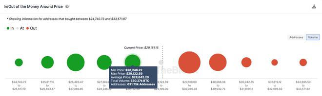 鉴于目前温和的看跌势头,比特币似乎将短暂绕行至 28,500 美元以下。但要做到这一点,空头必须突破 29,100 美元的阻力位。然而,如下所示,631,000 个地址以 28,600 美元的平均价格购买了 5.3 亿个BTC ,可能会阻止下跌。