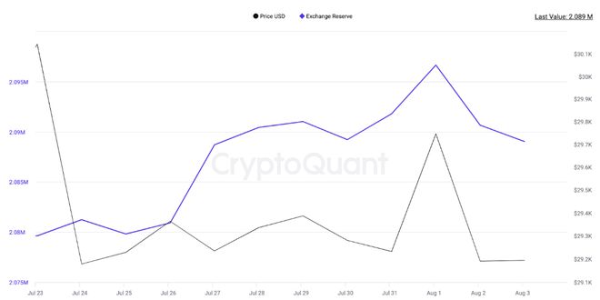 据Cryptoquant称,本周比特币交易所供应量大幅增加。投资者似乎对比特币价格停滞在 29,000 美元至 29,900 美元范围内越来越警惕。作为回应,他们已开始将BTC转移到交易所,以应对潜在的看跌逆转。