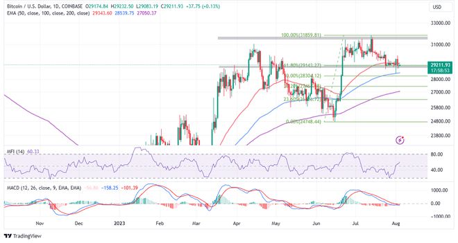 比特币价格窄幅波动,支撑位为 29,000 美元。市场前景暗示波动性爆发的可能性。