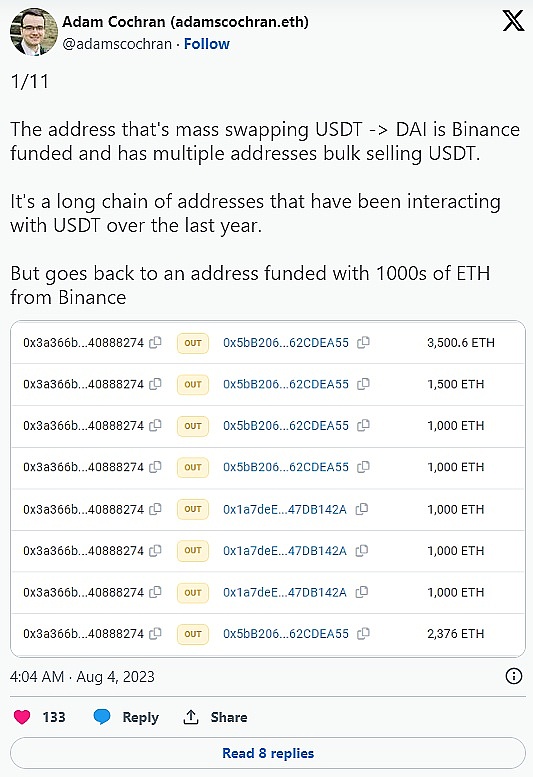 金融分析师 Adam Cochran 还在 Twitter帖子中提供了更多背景信息。据他介绍,许多链上地址正在将 USDT 兑换成 DAI,其资金来源是来自币安的拥有数千个以太坊 ( ETH )的地址。