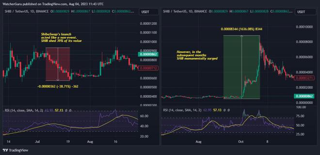 然而,此次推出未能对 SHIB 的价格产生积极影响。发行当天,SHIB 的股价呈绿色蜡烛,但两周内,其市值蒸发了近 39%。然而,在接下来的几个月里,SHIB 大幅上涨。从 2021 年 9 月的低点开始,该资产升值幅度高达 1636%。