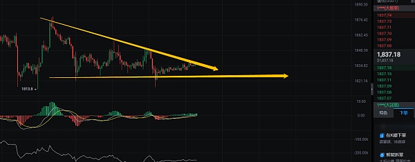 姨太1H的结构,姨太的向下三角形的话,目前已经到压力附近,看这里能够往上突破一些。不过就算突破也是够呛,整体的走势包括大饼都是属于一个没有方向可言,所以个人认为还是一个收敛三角变成一个矩形中枢的一个震荡过程而已。