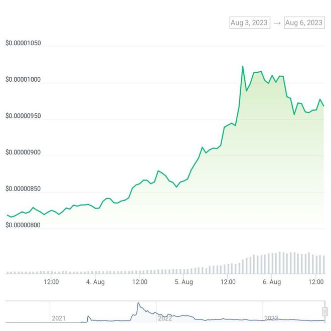 柴犬 (SHIB) 价格从 8 月 4 日的低点 0.00000827 美元上涨至 8 月 6 日早些时候的 0.00001028 美元。根据 CoinGecko 的统计数据,到目前为止,过去 7 天上涨了 12.24%。