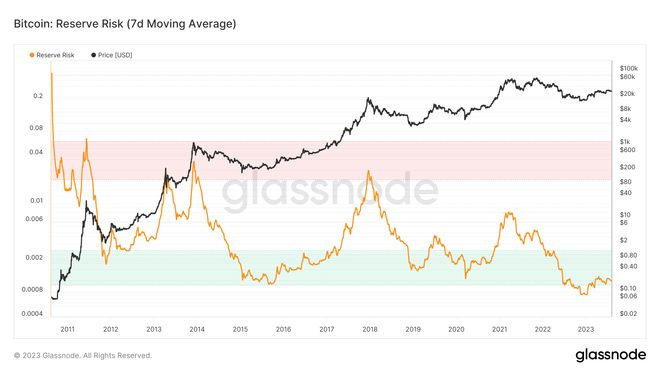 根据链上分析工具Glassnode的数据,比特币储备风险指标的7日平均值跌至一个月低点。储备风险是一个较少使用但可靠的指标,在衡量比特币的长期增长潜力时派上用场。