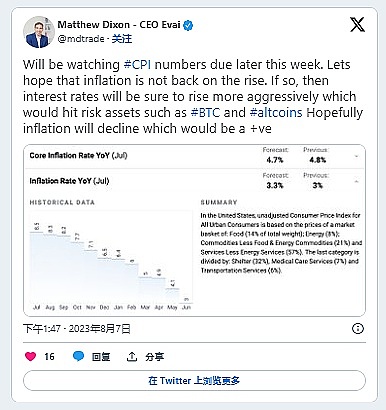 市场分析师 Matthew Dixon 最近在社交媒体上表达了他的担忧,暗示如果通胀上升,可能会产生一系列影响,包括进一步加息,这可能会对加密货币产生重大影响。
