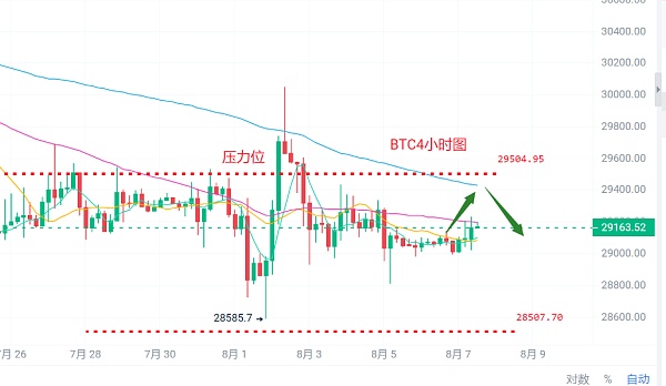 大饼昨日高点29205附近,低点28990附近。上周五晚间美国公布非农就业数据显示,美国劳动力市场放缓,但工资稳健增长且失业率下降,意味着仍不能排除美联储进一步收紧货币政策的可能性,数据公布后对市场几乎没有影响。大饼在周末的波动基本萎缩到了极致,波幅仅100多点,原因还是因为近期市场流动性的匮乏,这种波动下基本没什么操作空间,目前大饼处在选择方向中,耐心等待市场选择方向。