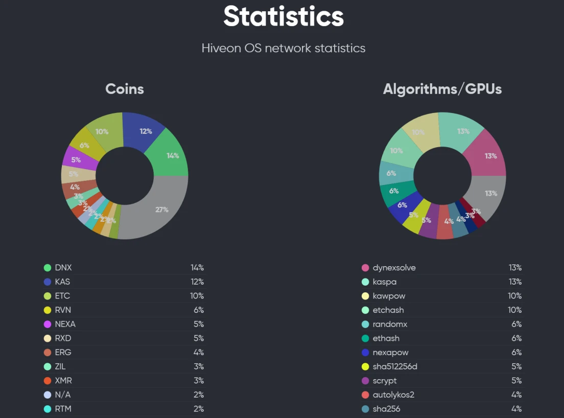 Dynex 主要利用 GPU 的计算能力。根据hiveon.com计算管理平台的统计,DNX目前占算力的14%,是该平台计算范围内最大的pow代币。